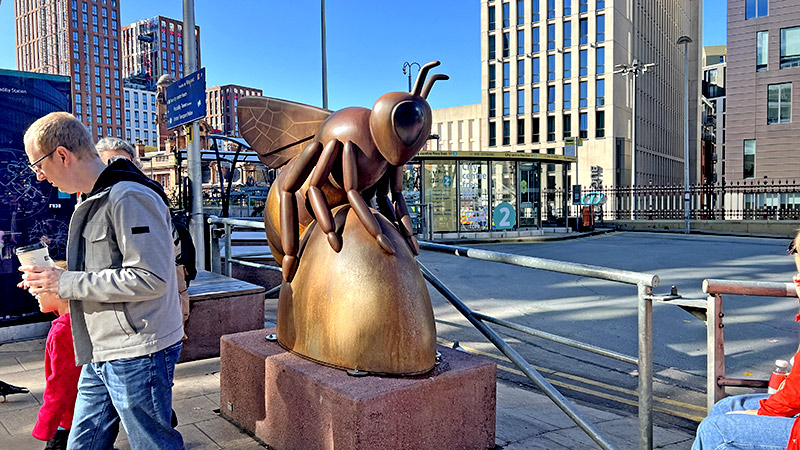 マンチェスターを象徴する蜂。街の至る所に蜂マークがついています。これは産業革命期の勤勉さの象徴であり、現代では団結・追悼・誇りのシンボルだそうです。また産業革命の中心地の一つだったマンチェスターの工場を「忙しいハチの巣」と例えたとのこと。