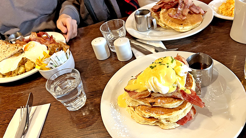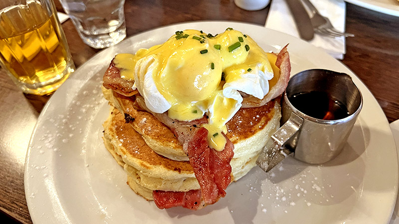 「Pancake Benedict」を頼んでみました。パンケーキ3段重ねにベーコン、ポーチドエッグにオランデーズソース。メイプルシロップはおかわり自由!